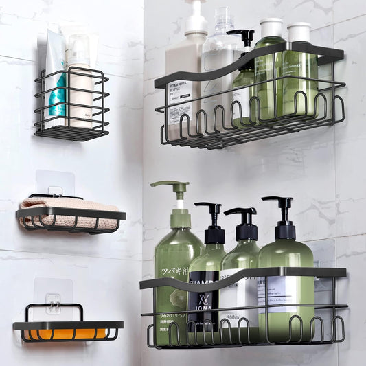 Set de 5 Rafturi Multifunctionale de Dus cu Adeziv Super Puternic, Organizator de Baie sau Bucatarie, Suport de Dus din Otel Inoxidabil cu 7 Carlige, Greutate Maxima Suportata de 18kg Fara Perforare, Grosime 3 mm, Capacitate Mare, 5 Piese, Negru