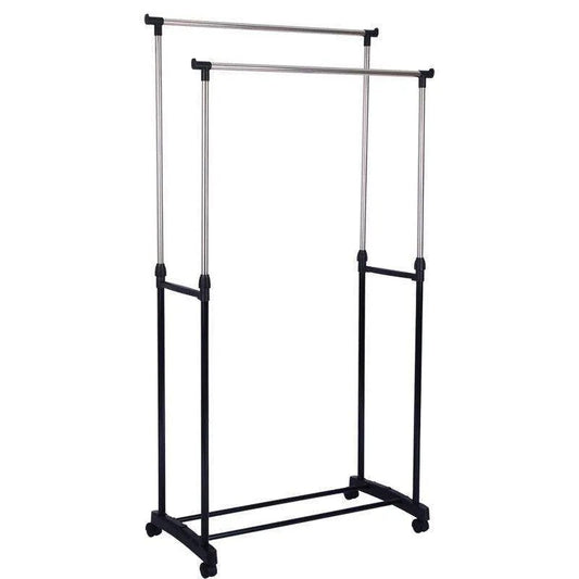 Suport Dublu HOZRO, pentru Umerașe – Reglabil pe Înălțime, 4 Roți, Argintiu
