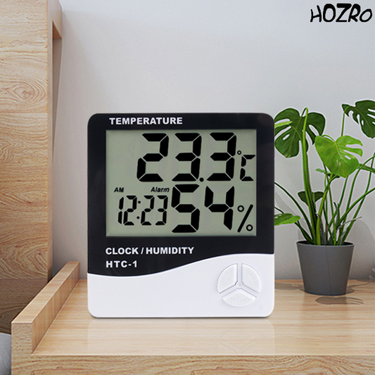 Termometru și Higrometru Digital HTC-1 HOZRO, cu Ecran LCD Mare, Funcție Ceas și Calendar, Alarmă Integrată, Afișare Temperatură și Umiditate cu Memorie MAX/MIN, Montaj pe Perete sau Birou, Ideal pentru Casă, Birou, Depozite și Camere de Bebeluşi