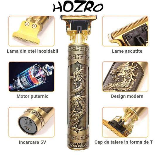 Masina de tuns HOZRO, cu acumulator, 5W, trimmer, model dragon, 5 marimi, incarcare USB, Auriu negru