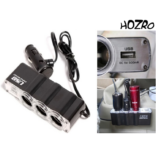 Priză Triplă Brichetă Auto HOZRO, Adaptor 12V/24V cu 3 Porturi pentru Alimentare Simultană, USB Integrat, Protecție la Supratensiune și Design Compact, Ideal pentru Telefon, GPS și Accesorii Auto