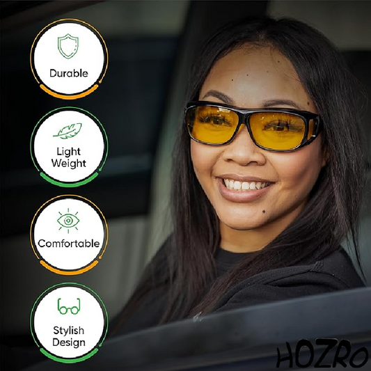 Ochelari de Noapte HOZRO, cu Lentile Galbene – Se Poartă Peste Ochelari de Vedere, Design Wrap Around, Reduc Oboseala Oculară și Strălucirea Farurilor, Ideali pentru Condus