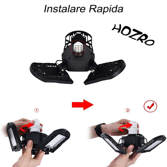 Lampa LED cu 3 brate mobile, HOZRO, putere 30W, 36 LED-uri, Bec Iluminare pentru interior Garaj/Depozit/Atelier, 3 aripi Pliabile, flux luminos 3000lm, lumina alba rece 6500K