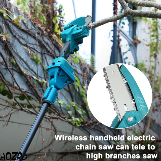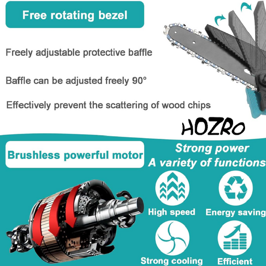 Drujbă electrică portabilă fără fir HOZRO, mini drujbă cu lanț puternic, 2 acumulatori reîncărcabili și mâner reglabil, ideală pentru tăiere lemn, crengi, pomi și lucrări gospodărești eficiente