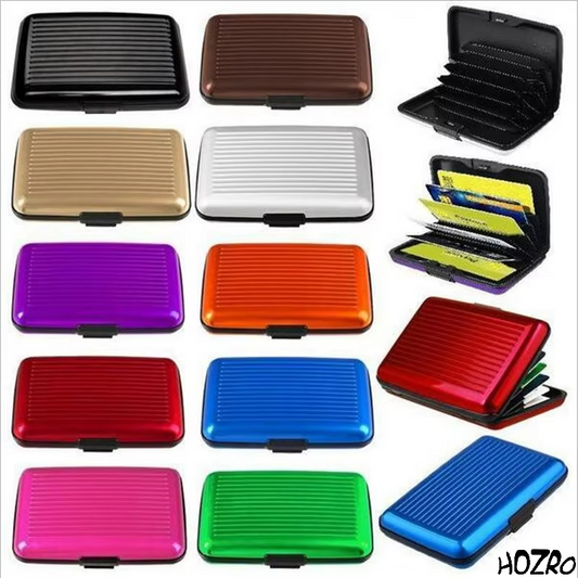 Portofel pentru Carduri din Aluminiu HOZRO, cu Protecție RFID, Design Compact și Rezistent la Șocuri, 6 Compartimente Interioare, Închidere cu Clamă, Ideal pentru Carduri Bancare, Documente, Abonamente și Vizite – Varianta Unisex, Multicolor