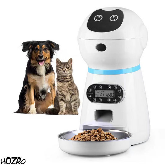 Dispenser automat de hrana pentru caini si pisici HOZRO, capacitate 3.5L, programabil cu functie de inregistrare vocala, bol din inox si senzor infrarosu pentru distribuire exacta a hranei, alb