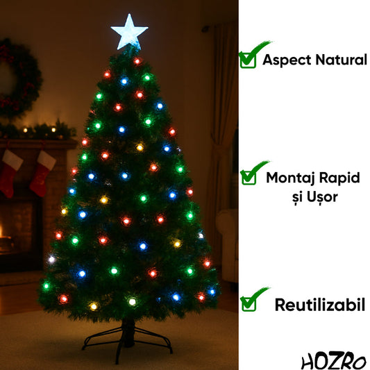 Brad artificial de Crăciun HOZRO, cu iluminat LED multicolor, stea luminoasă în vârf și suport metalic rezistent inclus – ramuri bogate, design realist și decor festiv spectaculos pentru sărbători pline de culoare și bucurie 🎄
