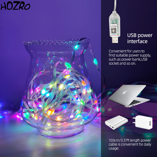Instalatie Luminoasă Smart RGB HOZRO, Pentru Brad, 10M cu 100 LED-uri, Control prin Aplicație QR, Alimentare USB, 7 Culori și Efecte Multiple – Iluminare Decorativă Inteligentă pentru Crăciun, Dormitor, Terasă sau Evenimente